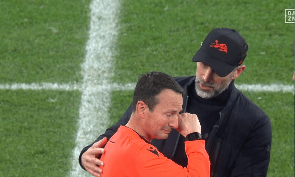 Nach Abpfiff geht Leipzig-Trainer Marco Rose (48) auf Linienrichter Alessandro Giallatini (49) zu, nimmt ihn etwas in den Arm, redet auf ihn ein. Der Italiener lässt seinen Tränen freien Lauf, wirkt emotional sehr mitgenommen.
