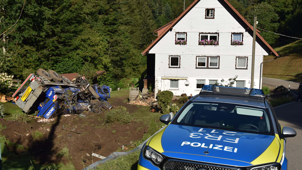 Am Samstag liegt der Stahl-Koloss noch immer dort, wo mal gepflegter Rasen und das hölzerne Gartenhäuschen waren. Der Garten mit Blick auf den Schwarzwald ist ein zerfurchter Acker voller Trümmer. Arbeiter sind mit der Bergung beschäftigt. Auch die Kreisstraße zum Unfallort ist noch gesperrt.