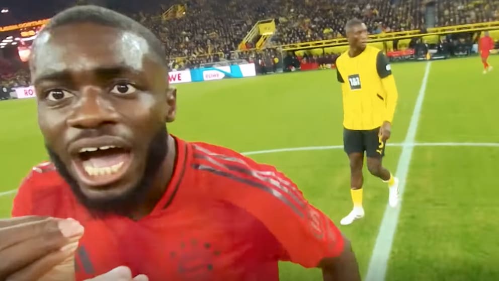 Bayern-Verteidiger Dayot Upamecano (26) macht seinem Ärger nach einem Pfiff Luft – wohl etwas zu heftig. Schiri Jablonski ruft ihn ran: „Upa, du musst auch aufpassen, dein Verhalten ist Grenze!“